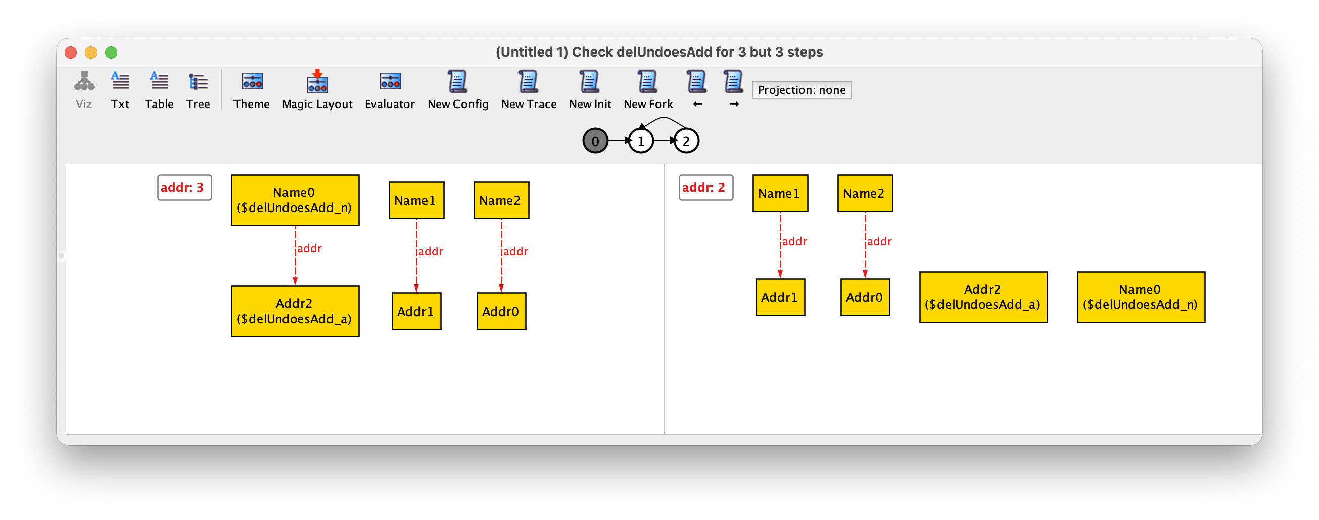 Notice the use of the after temporal operator, which is true for a formula if that formula holds in the next state. In this case we want to check that if add happens in the first state and del in the second (the next) state, then the value of addr in the third state is equal to the value of addr in the first state. Since we need three states to reason about this property we set the scope of 3 steps. As mentioned in the book, this assertion is not valid and a possible counter-example is the following.